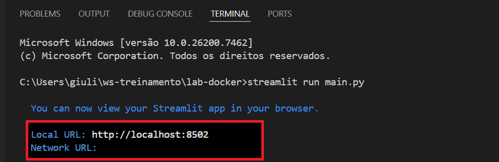Ao chamar o comando acima, mensagens no seu terminal deve aparecer, indicando o endereço que essa página web está localizada, como mostrado no print abaixo: