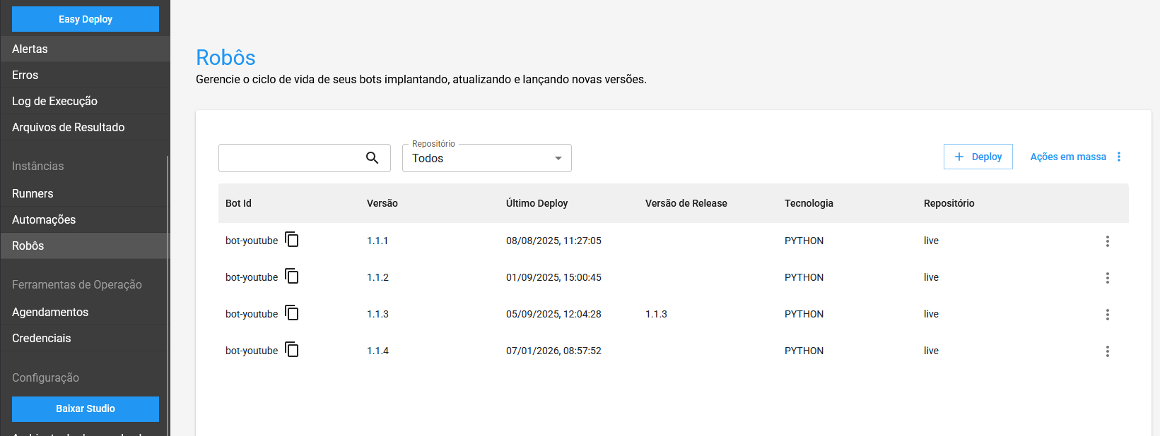 No Orquestrador BotCity, verifique na aba Robôs (menu lateral) as versões que foram implantadas.