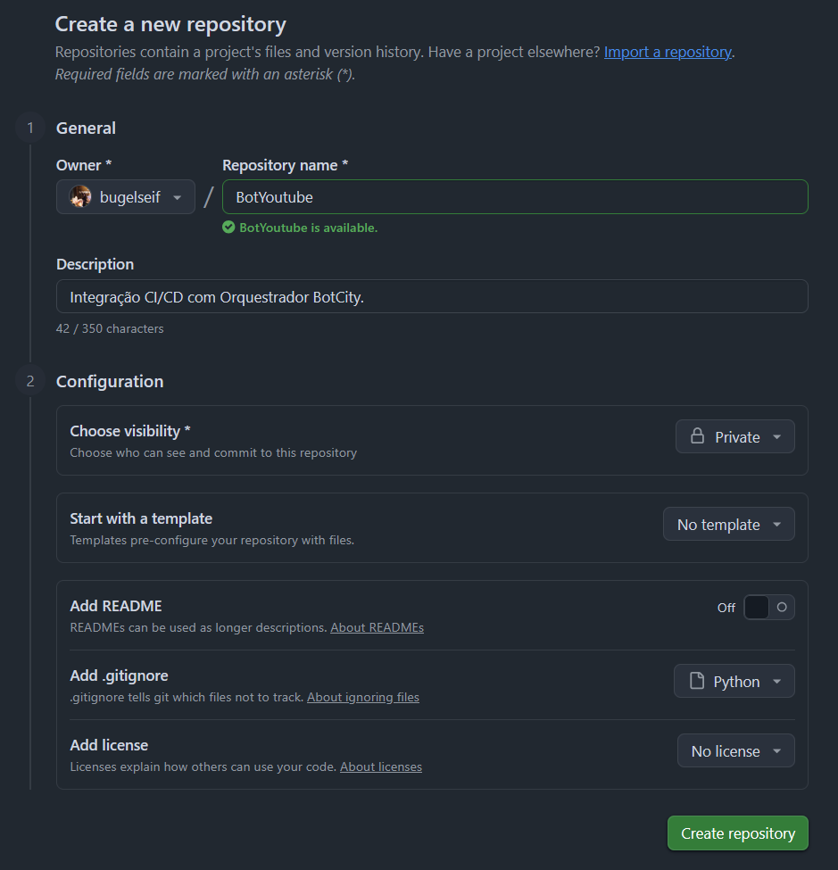 - Public ou Private: Se você deseja que o repositório seja público ou privado, pode marcar como