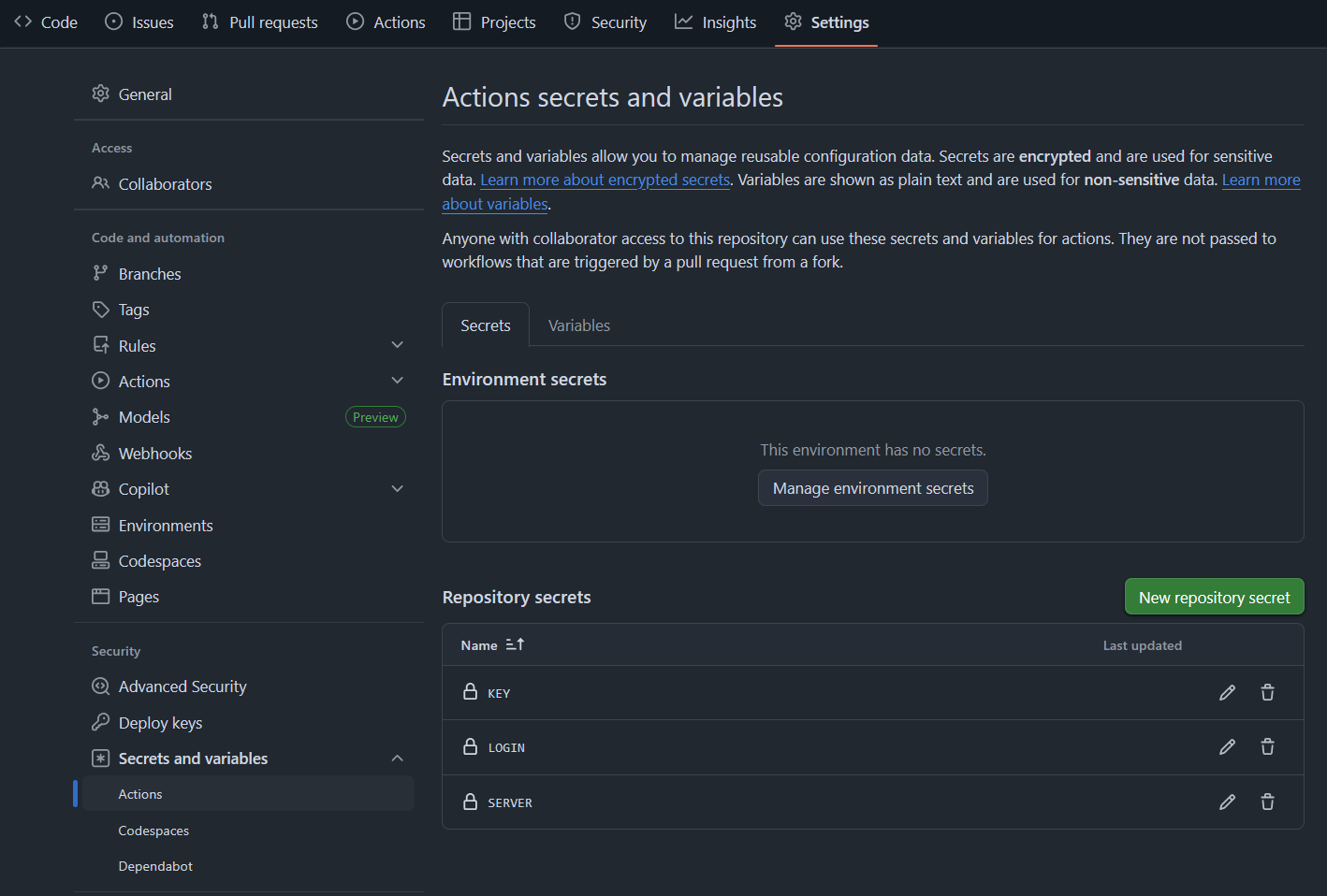 Com o repositório criado, vamos adicionar as credenciais de: SERVER, LOGIN e KEY como secrets no repositório do projeto. Você encontra essas informações em Amb. de Desenvolvedor, dentro do Orquestrador.