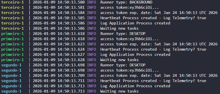 No terminal, aparecerá o log de cada um dos Runners configurados, indicando que estão prontos para receber tarefas.