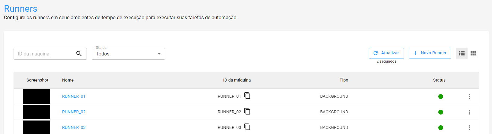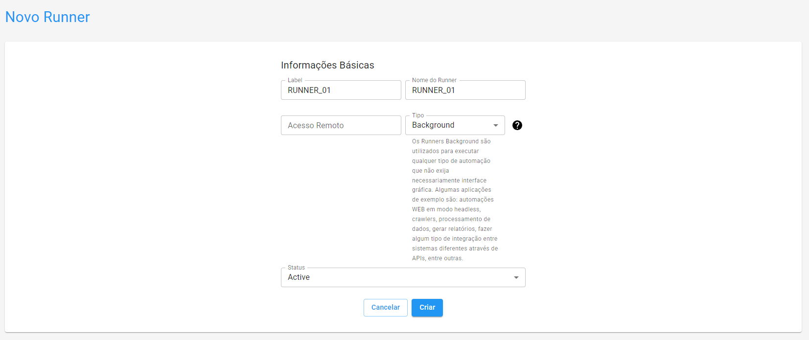 Label: ID do RunnerNome: Nome do RunnerAcesso Remoto(opcional): Caso tenha algum IP específico para acesso remoto, informe aqui.Tipo: Selecione o tipo de RunnerBackground.Status: Selecione o status do RunnerAtivo.