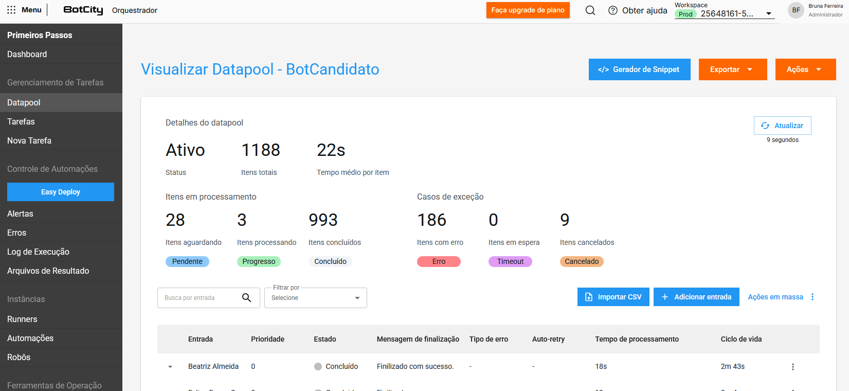 Acesse também o Datapool criado e veja que teremos três itens que estão em processamento ao mesmo tempo.