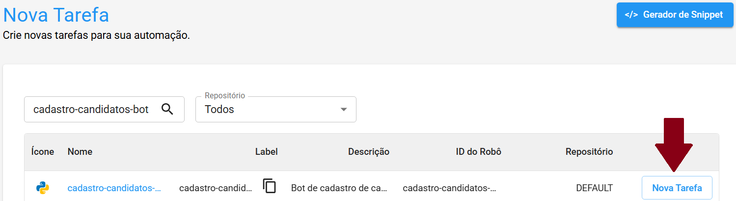 Para iniciar o processamento, acesse o menu Nova tarefa, procure pela automação BotCandidatos, e clique em Nova Tarefa.