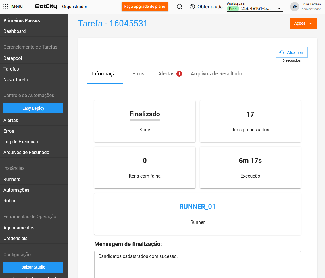 Acessando os detalhes de cada tarefa, veja quantos itens cada uma processou com sucesso ou se houve itens com falha.