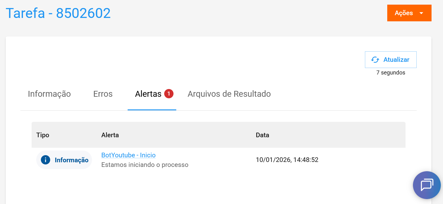 Quando executarmos a tarefa, vamos poder observar que um novo alerta foi gerado na tela de Alertas.