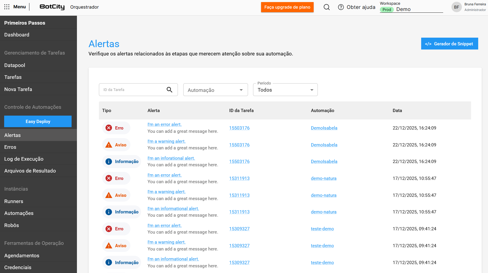 Os Alertas são utilizados para obtermos notificações que descrevem algum aspecto de uma automação, facilitando seu acompanhamento.