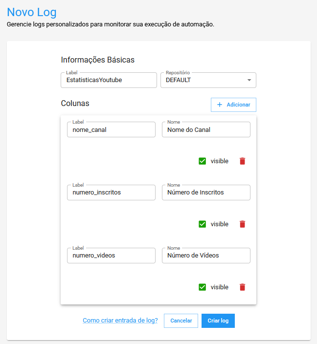 - Label: Identificador único deste log que utilizaremos para interfacear com o log via API ou SDK.