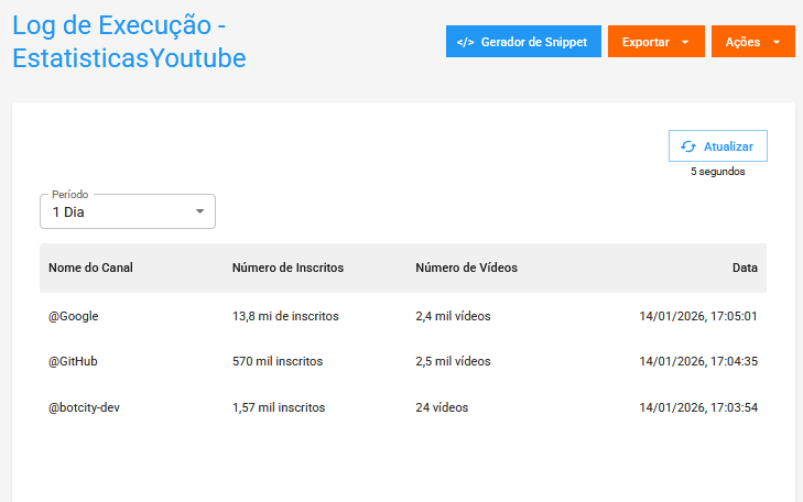 Dessa forma, os times podem acompanhar todas as informações coletadas diretamente no Orquestrador BotCity, além de possibilitar a criação de relatórios baixando os dados em diversos formatos no botão Exportar.