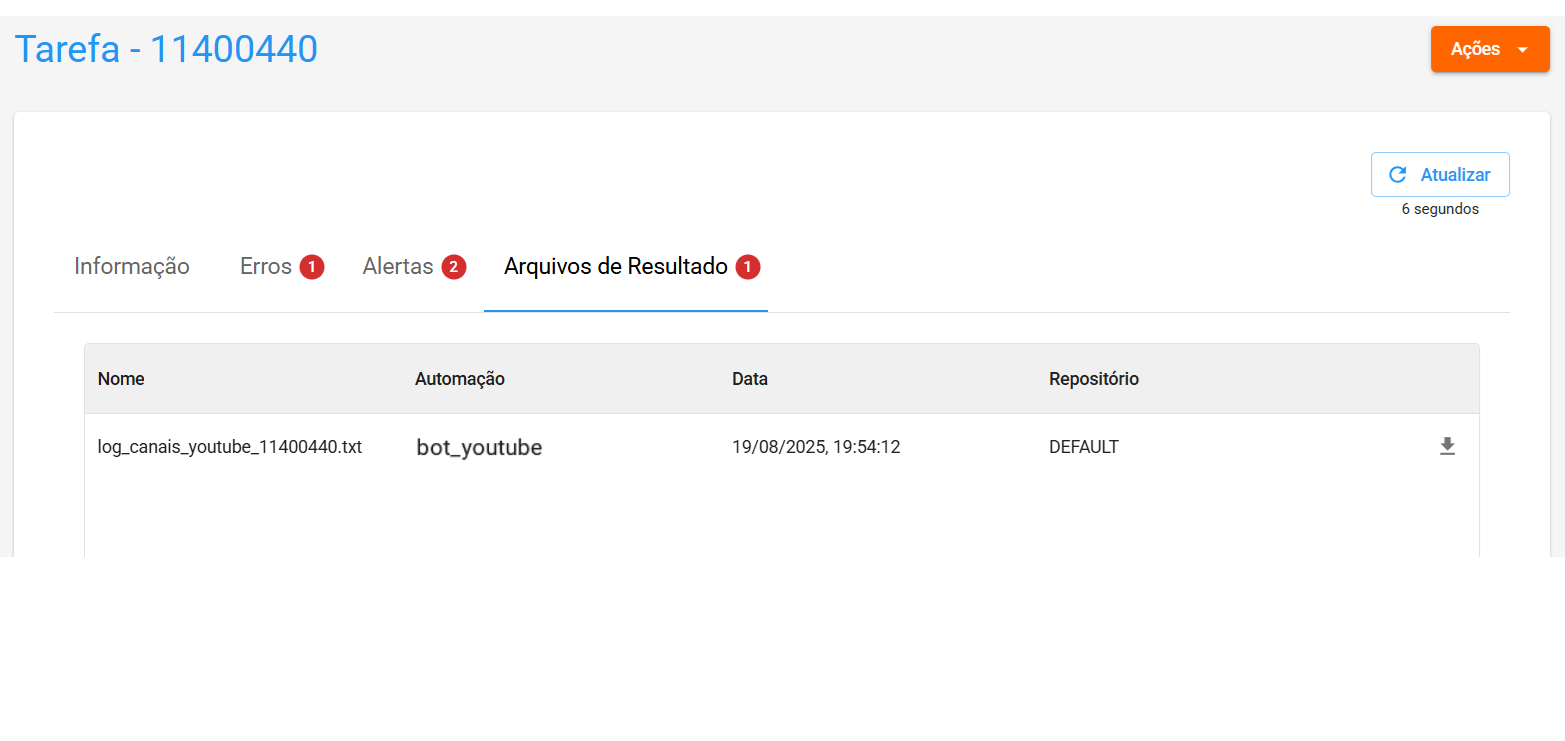 Outra forma de deixar dados disponíveis no Orquestrador BotCity é através do upload de arquivos de resultado.